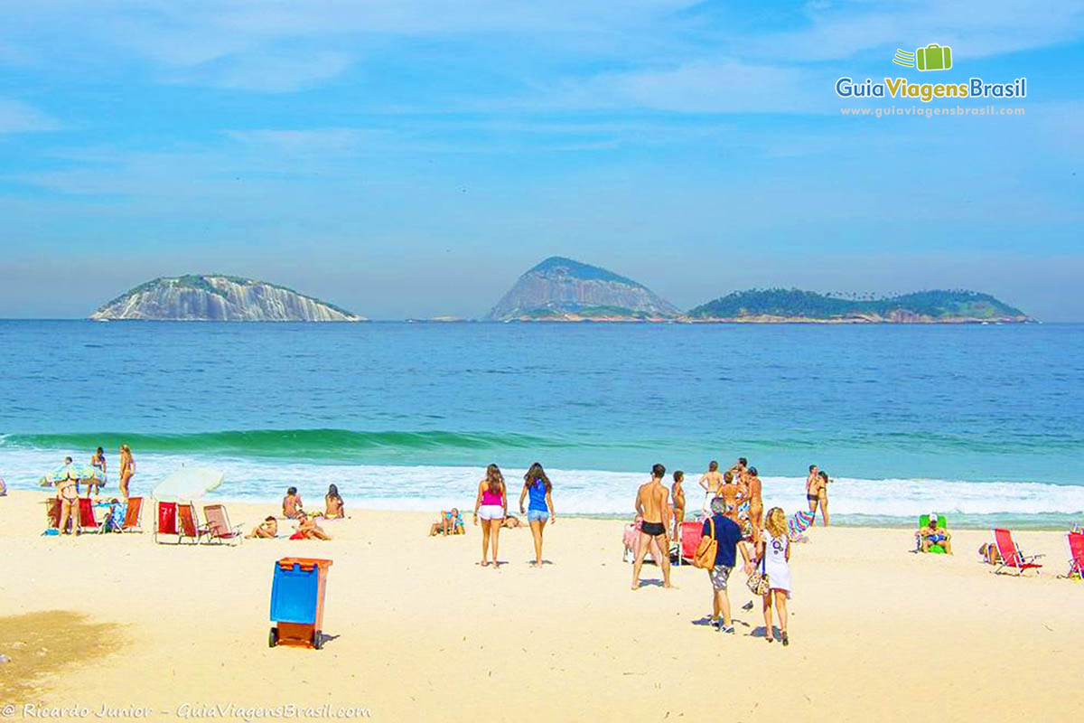 O mar aqui já é bem mais tranquilo e muito indicado para quem não dispensa um bom mergulho. A Praia de Copacabana é bastante frequentada e nos meses de verão cada cantinho é disputado. Você pode chegar até aqui apenas para conhecer o lugar e fazer uma caminhada pelo famoso calçadão da orla. A festa mais tradicional acontece no Réveillon, onde a praia é palco para uma das maiores festas de ano novo do Brasil e também onde há a queima de fogos da virada.