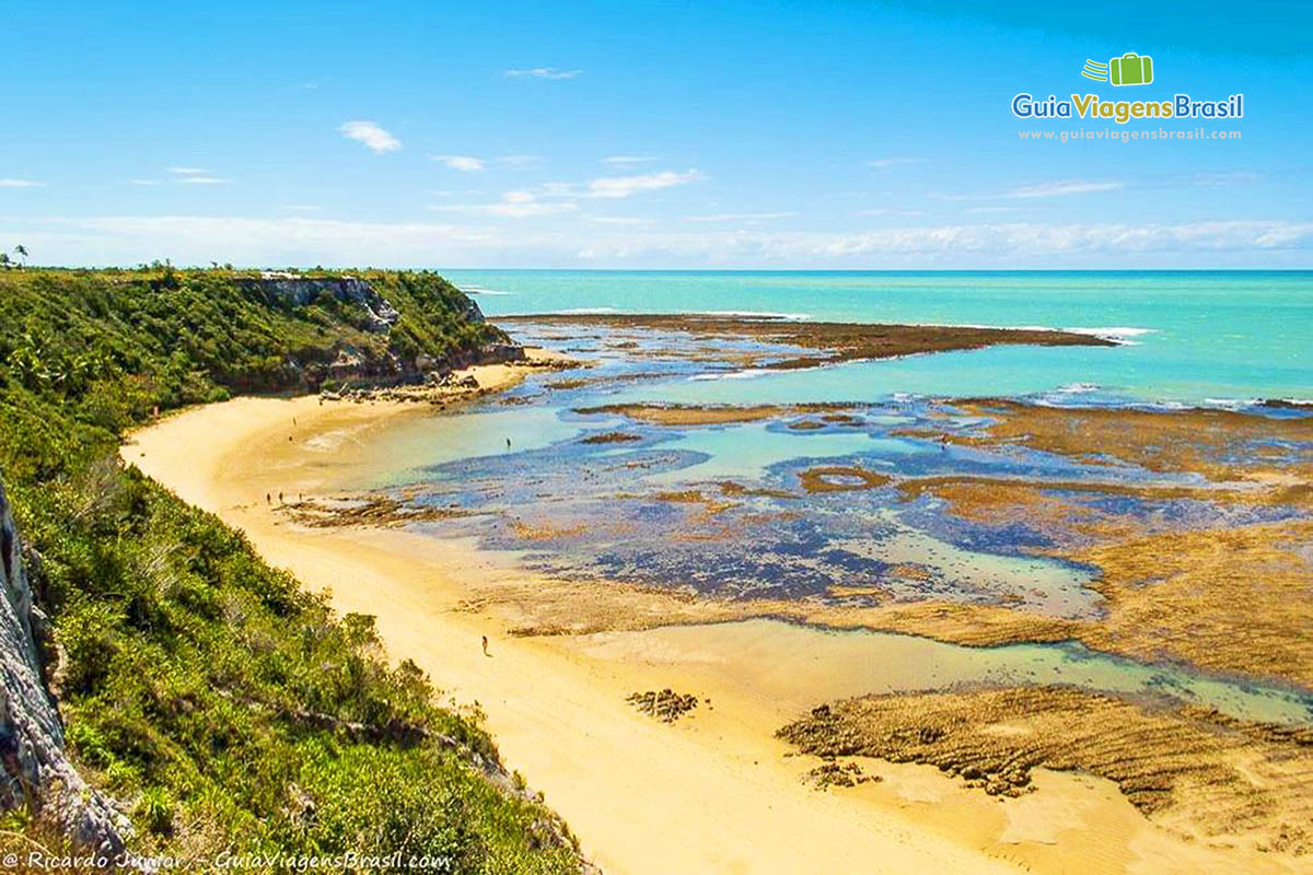 Veja fotos da belíssima Praia do Espelho, no distrito de Trancoso, em Porto Seguro, Bahia. A Praia do Espelho, que, na verdade, se chama Curuípe, ganhou o apelido de Espelho pelo mar calmo refletir o céu. Atualmente, ela é conhecida pelos dois nomes. A Praia do Espelho tem formato de enseada, emoldurada por falésias brancas e avermelhadas que contrastam com os coqueirais verdinhos da orla. O mar é tão calmo e com corais que formam lindas piscinas naturais de águas mornas, ideais para banhos relaxantes. No alto da falésia há um mirante para vislumbrar a incrível região e também a Vila do Outeiro, com lojas e restaurantes. Em direção à Trancoso, do lado esquerdo da praia, ficam as charmosas pousadas e barracas pé na areia, que servem como ponto de apoio para os passeios de escuna na região. Do lado direito, a Praia do Espelho é mais deserta, ideal para quem busca sossego para relaxar em meio ao paraíso.